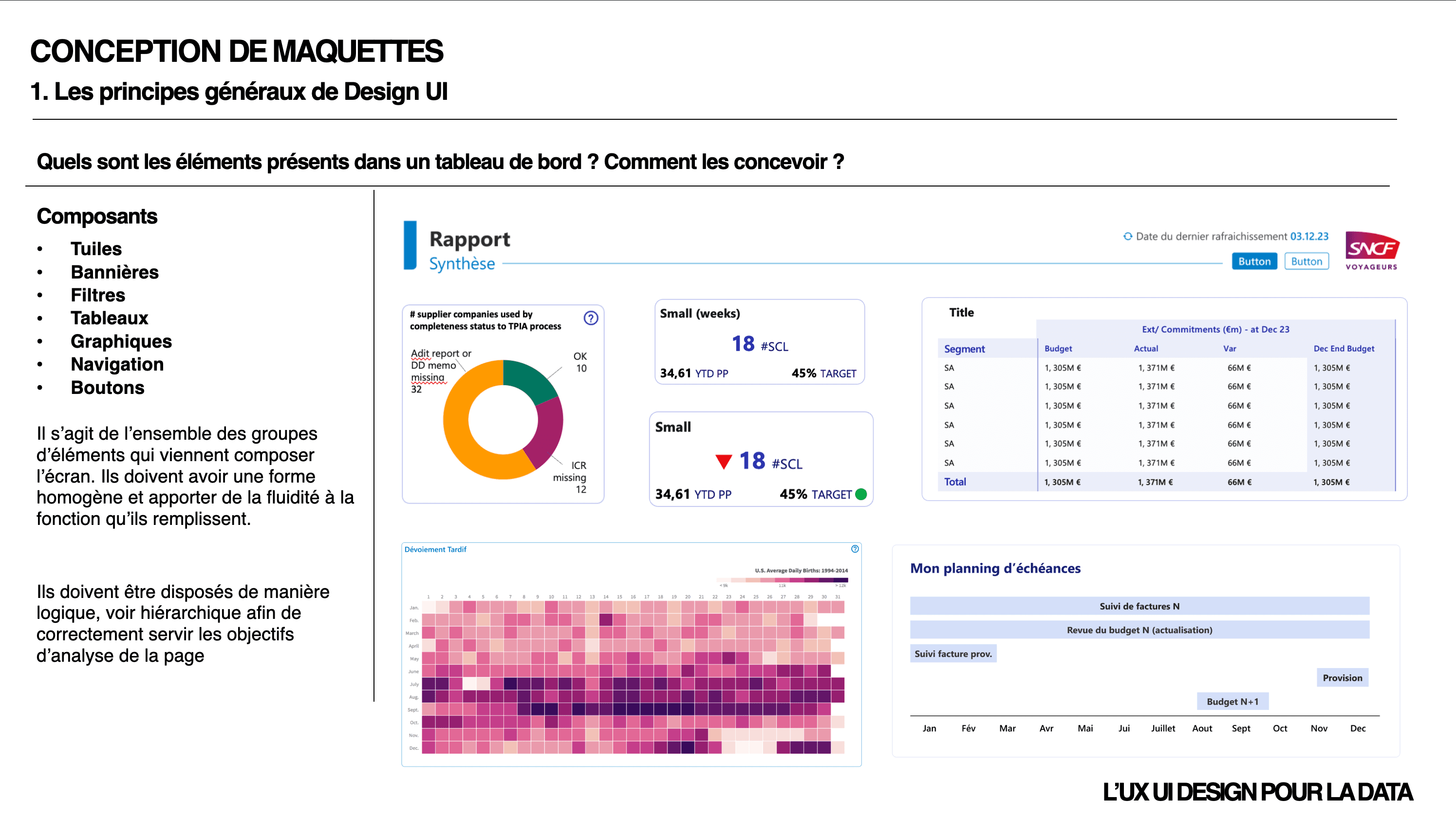 En trois blocs progressifs : la démarche UX (cadrage, recherche utilisateur, priorisation), la conception de maquettes (principes UI, ergonomie des dashboards, choix des visualisations, design système), et l'intégration dans Power BI (thèmes, personnalisation JSON, bonnes pratiques). Le tout ponctué d'exercices sur des cas réels — identifier des problèmes ergonomiques, co-concevoir des solutions, arbitrer entre lisibilité et densité d'information.