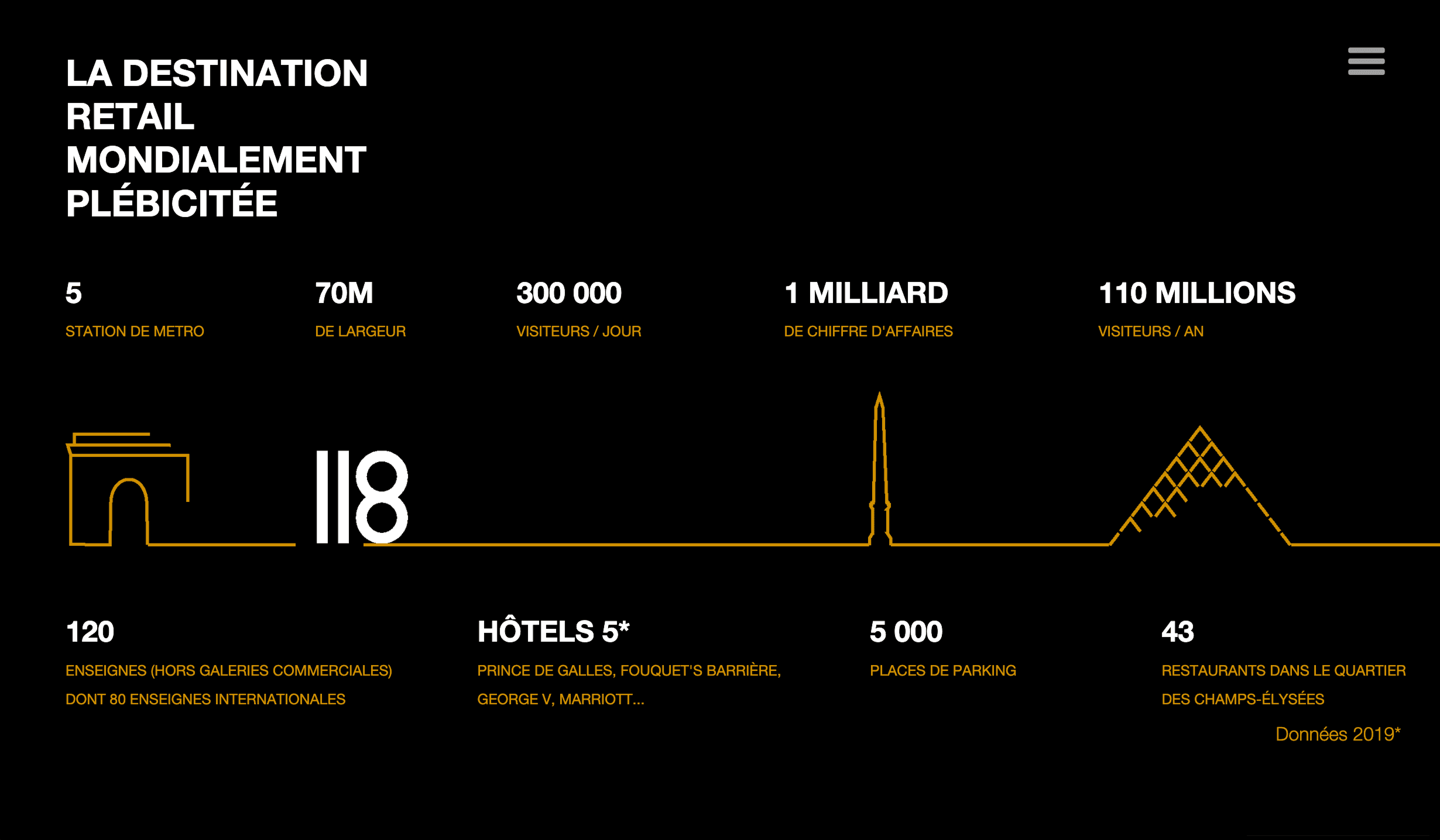 Un site vitrine one-page conçu et intégré sur Webflow pour la commercialisation d'un espace retail de 1 000 m² situé au 118 des Champs-Élysées. La cible : des enseignes haut de gamme et de luxe à la recherche d'un emplacement de prestige. Le site intègre une vidéo de présentation, une galerie photos, des données chiffrées sur l'environnement commercial, un plan, une visite virtuelle Matterport 360°, un formulaire de contact et une brochure téléchargeable.